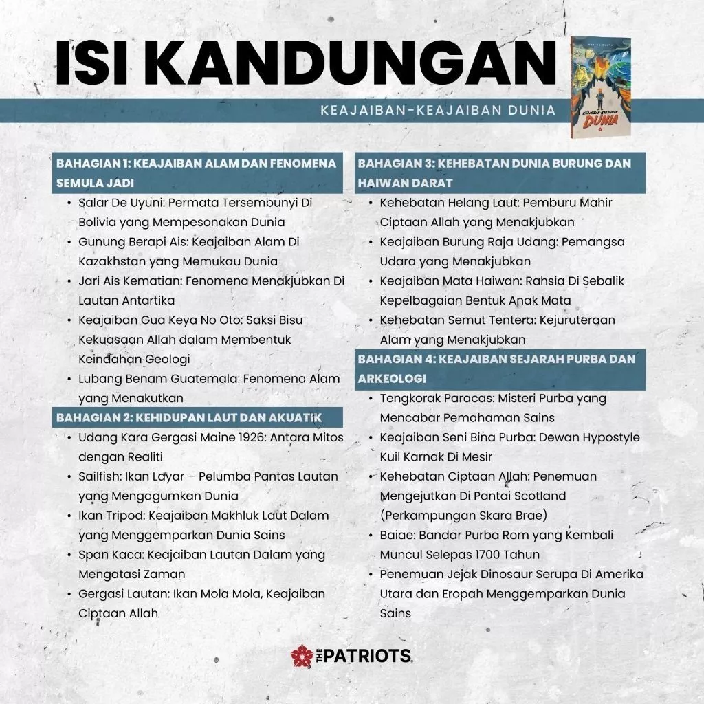 Buku ini menghimpunkan puluhan kisah unik dan menakjubkan yang disusun merentas tujuh tema utama: keajaiban alam, kehidupan laut, dunia burung dan haiwan, sejarah purba, eksplorasi angkasa, seni bina luar biasa, serta fenomena masyarakat dan sains kontemporari.