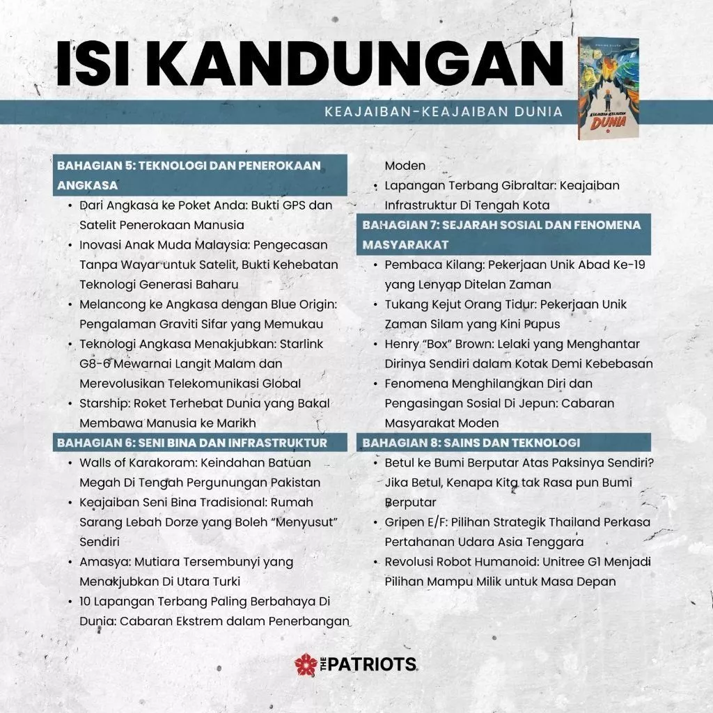 Setiap kisah ditulis dengan gaya yang padat, informatif dan menggugah minda — menjadikan buku ini bukan sahaja sebagai bahan bacaan santai, tetapi juga sebagai sumber inspirasi dan pengetahuan.